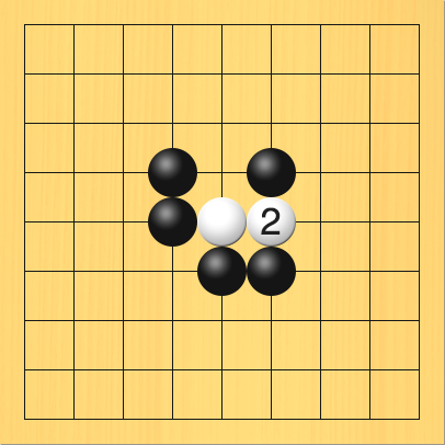 相手の石を包囲ほういして、直接ちょくせつアタリをかけなくても石を取ることができるテクニックのこと。下図の形のとき、黒はどこに打てば白石を取れるでしょうか。